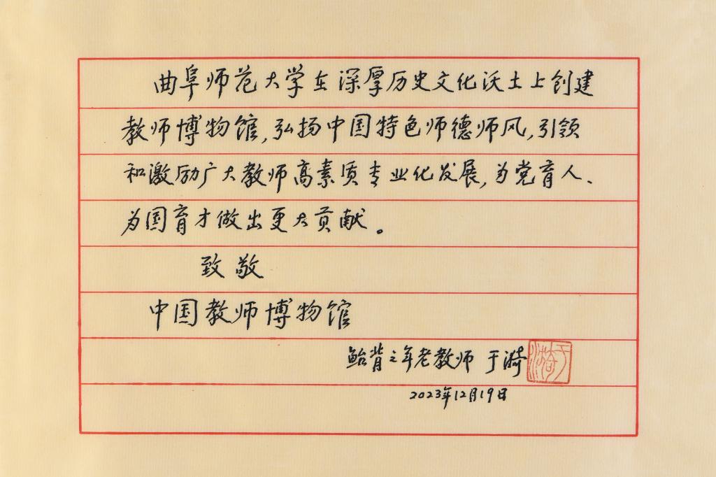 九十四岁高龄的于漪先生精神矍铄,愉快地回忆起曾到孔子故里参观的情景,关切地询问曲阜师范大学和博物馆有关情况。了解到学校提出建设高水平孔子家乡大学、积极发展师范教育,她赞赏谋划得好、定位得准,办好师范教育关系到国家百年大计,办好孔子家乡大学对社会有示范意义;了解到博物馆保存和展示了两千多年教师发展史、百年师范教育发展史、历代教育家和当代师德楷模的风范,她赞赏“曲阜师范大学能够办起我们这个国家的教师博物馆,我觉得非常好,做对了!”“这个真了不起!”“全国的老师都去看看,带着一种敬仰受教育”。