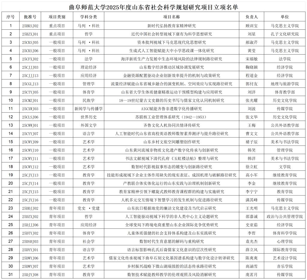 社会科学处讯 日前,山东省哲学社会科学工作办公室正式公布2025年度山东省社科规划研究项目立项名单。曲阜师大共获批立项31项,其中重点项目2项、一般项目20项、青年项目9项,立项总数位列省属高校第3位。