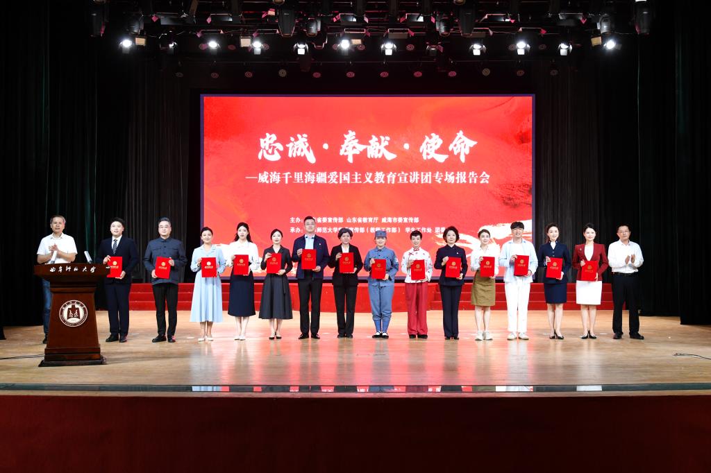 党委宣传部讯 9月17日,曲阜师范大学邀请威海千里海疆爱国主义教育宣讲团走进学校,开展了“忠诚·奉献·使命”主题宣讲暨大中小学思政课一体化研习会,校地携手上好了一堂“思政大课”。学校党委副书记刘涛,党委常委、宣传部部长孙祥广出席活动。