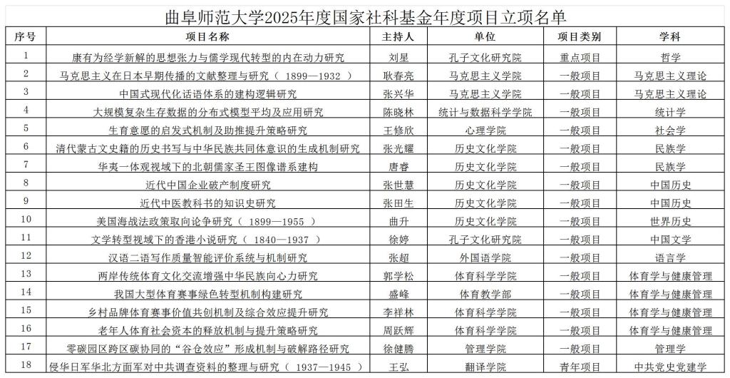 社会科学处讯 日前,全国哲学社会科学工作办公室正式公布了2025年国家社科基金年度项目和青年项目立项名单,曲阜师大共有18个项目获批立项,其中重点项目1项、一般项目16项、青年项目1项。此外,曲阜师大近期获批了5项国家社科基金教育学单列项目、1项国家社科基金艺术学单列项目。截至目前,曲阜师大本年度已获批24项国家社科基金项目,立项总数位列山东省属高校第2位。
