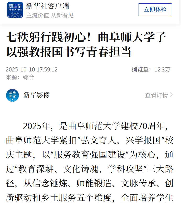 2025年,是曲阜师范大学建校70周年,在这样一个重要的历史时刻,曲阜师范大学团委紧扣“弘文育人,兴学报国”校庆主题,以“服务教育强国建设”为核心,通过“教育深耕、文化铸魂、学科攻坚”三大路径,从信念锤炼、师能锻造、文脉传承、创新驱动和乡土服务五个维度,全面培养学生综合素养,创新构建起“1核3径5维”的实践育人体系,为青年学子搭建起“在实践中受教育、长才干、作贡献”的广阔平台。