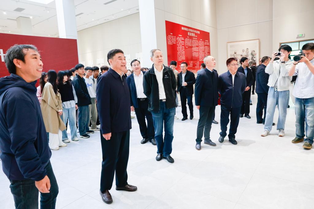 在观展过程中,领导们仔细聆听作品讲解,并与参展作者深入交流,详细了解作品的创作理念和过程。学校领导对展览的整体水准和学术内涵给予充分肯定,表示这些作品既延续了学校深厚的文化传统,又展现出守正创新的艺术追求,是献给七十周年校庆的一份深情厚礼。