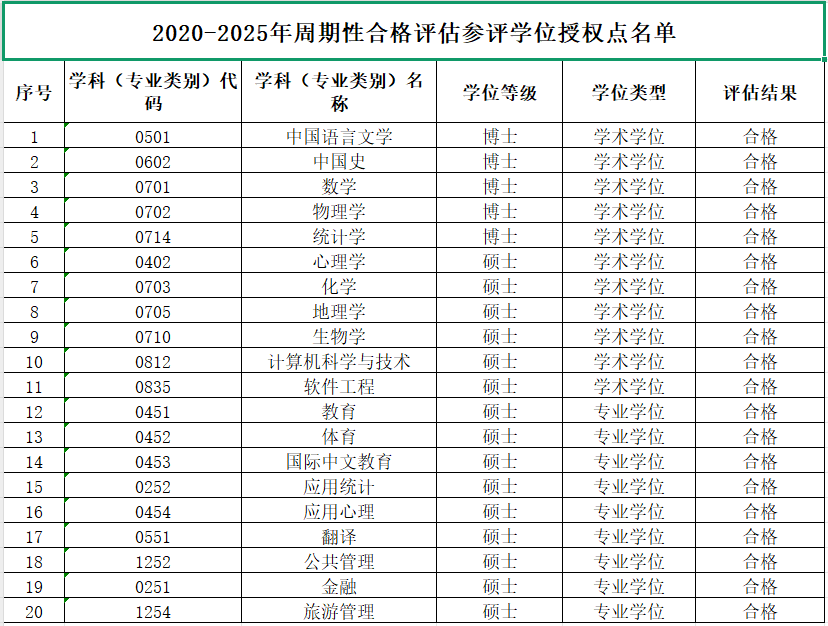 研究生处讯 近日,国务院学位委员会办公室、山东省人民政府学位委员会公布了2020-2025年学位授权点周期性合格评估结果。曲阜师大5个博士一级学科学位点、6个硕士学术学位点、9个硕士专业学位点参与评估。其中被抽评的数学、物理学2个博士一级学科授权点,化学、物理学、生物学3个硕士一级学科授权点,金融、应用统计、体育3个硕士专业学位授权点,全部通过合格评估,显示了学校良好的学科建设水平和研究生培养质量。