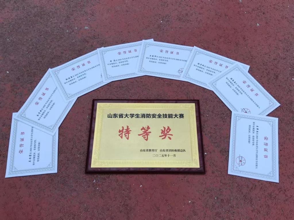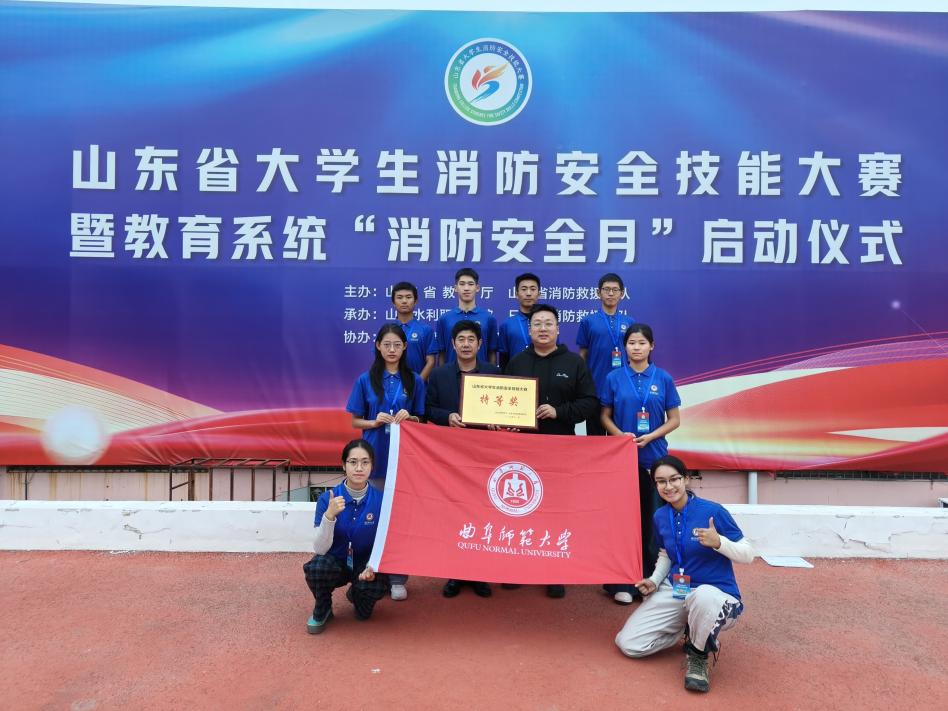 学生工作处讯 近日,由山东省教育厅、山东省消防救援总队联合主办的首届山东省大学生消防技能大赛圆满落幕。经过激烈角逐,由周漾、吴亦霏、王梦冉、朱子熙、张为春、杨子政、耿俊豪、王培洋8位曲师学子组成的参赛队凭借扎实专业功底、精湛实操技能与默契团队协作,从全省51所参赛本科院校中脱颖而出,成功摘得大赛最高荣誉——特等奖。