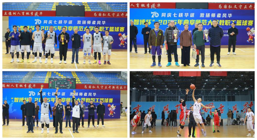 本次篮球赛由学校工会主办,教职工篮球协会承办,体育学部协办。比赛自10月24日开赛,历时17天,设有5V5全场篮球对抗赛和男女混合运球接力赛两大项目。其中,5V5对抗赛共有13支代表队参加,物理工程学院夺得冠军,机关和化学与化工学院分获亚军、季军,物理工程学院党委书记于健获评“最有价值球员”。在男女混合运球接力赛中,化学与化工学院、物理工程学院和音乐学院分获前三名。赛事还选拔组建了由16人组成的曲阜师范大学教职工篮球队。