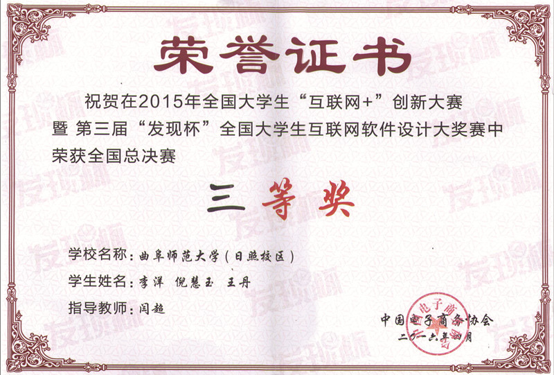 4月9日,由中国电子商务协会、杭州市商务委员会和杭州经济技术开发区共同举办的全国大学生“互联网+”创新大赛暨第三届“发现杯”全国大学生互联网软件设计大奖赛全国总决赛在杭州电子科技大学举行。我校信息科学与工程学院两支参赛队伍取得了“全国总决赛三等奖”的好成绩。