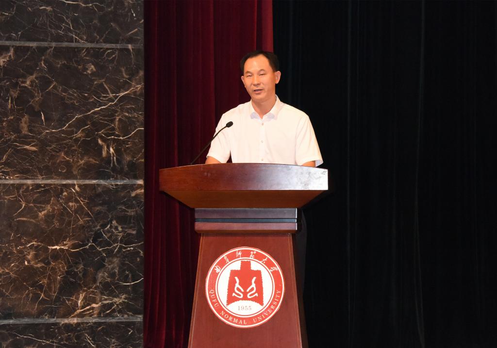 数学科学学院院长孟凡伟代表学院致辞,围绕学院的发展历程、专业设置及建设、学院特色、办学特色等方面为新生进行了详细的介绍,并希望他们在美丽的大学校园里找到心灵乐土,在实现自己理想的道路上踏出关键一步。
