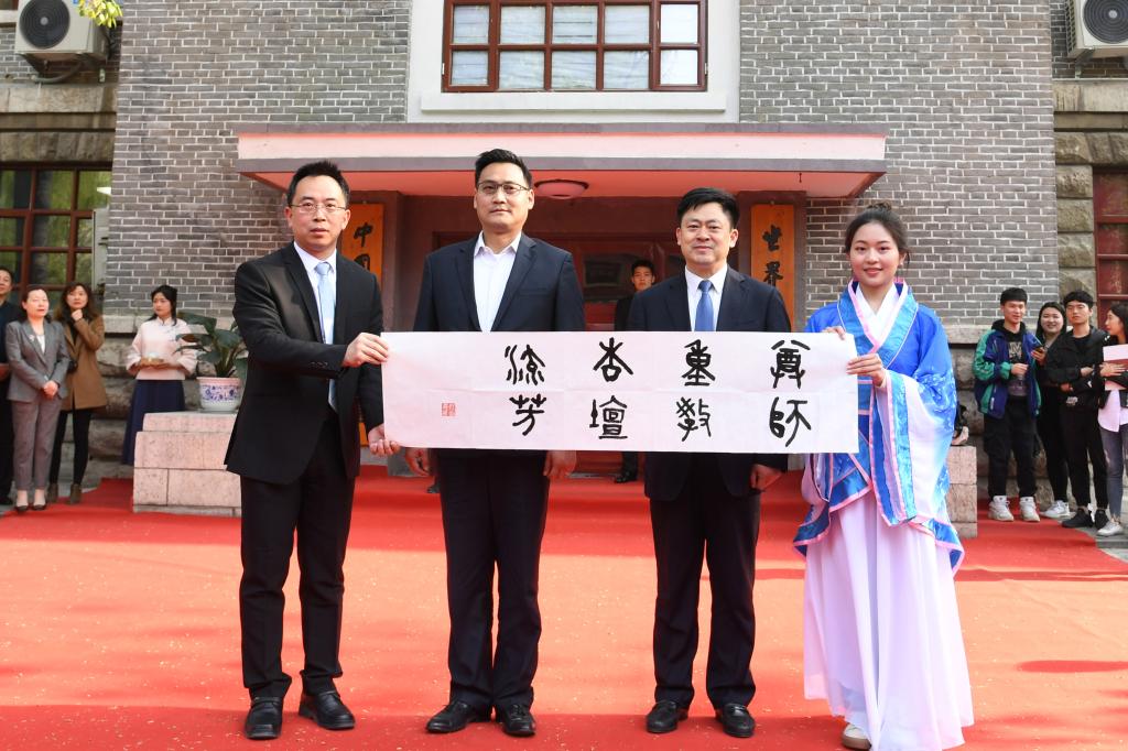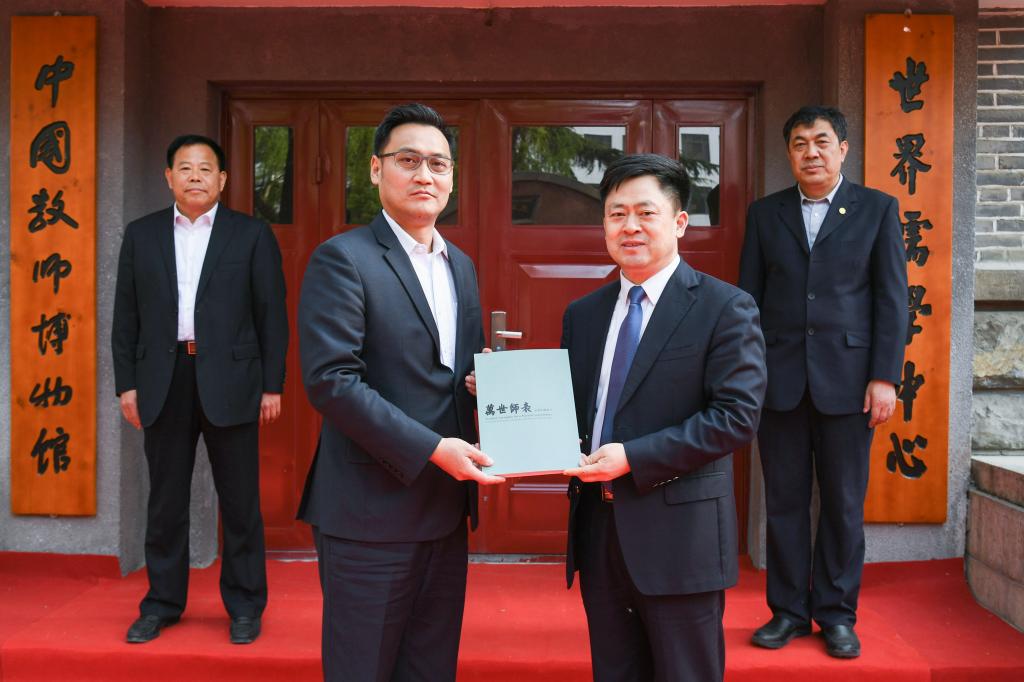 来到中国教师博物馆,戚万学向孔垂长先生赠送了中国教师博物馆特别定制的尼山石名章,孔垂长先生向博物馆赠送了《万世师表——书画中的孔子》一书。孔垂长、戚万学共同为中国教师博物馆青少年文化教育公益项目“杏坛学堂”揭牌。