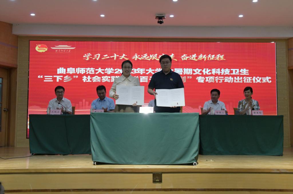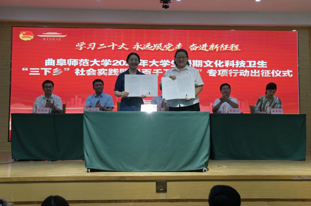 曲阜师大团委讯 为贯彻落实党的二十大精神和习近平总书记关于青年工作的重要指示精神,激励曲园学子积极参加暑期社会实践,曲阜师大于6月25日举行2023年大学生志愿者暑期文化科技卫生“三下乡”社会实践暨“百千万计划”专项行动出征仪式。党委副书记卢国强出席活动。