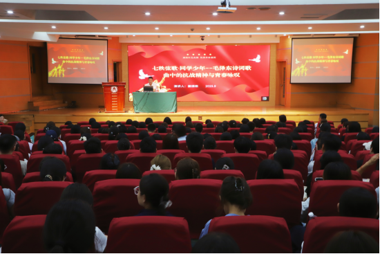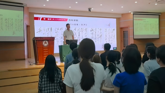 在课堂上,全体2025级新生齐声朗诵《沁园春·长沙》。“恰同学少年,风华正茂;书生意气,挥斥方遒……”。铿锵有力的声音在礼堂中久久回荡,同学们以昂扬之姿致敬峥嵘岁月,以青春之声回应时代召唤,展现出继承革命传统、矢志民族复兴的坚定决心。
