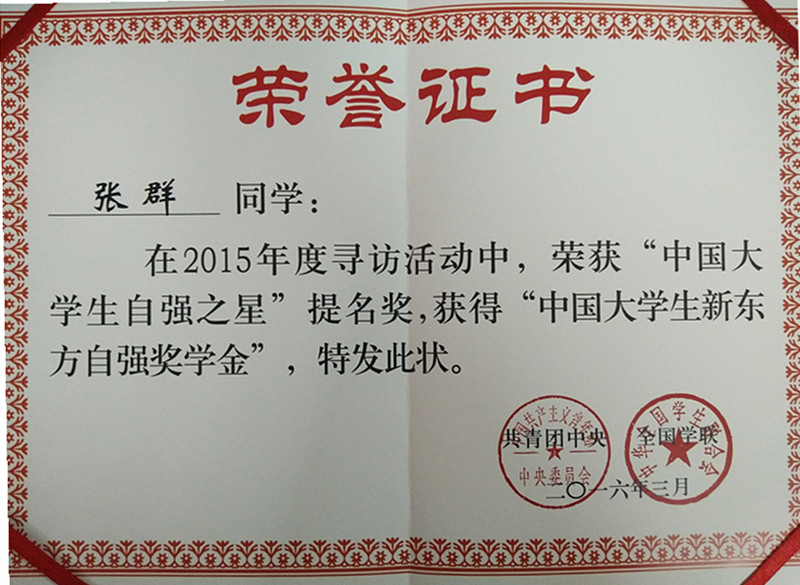 2015年度寻访“中国大学生自强之星”活动结果近日揭晓,我校法学院2012级学生张群荣获“中国大学生自强之星”提名奖,并获得“中国大学生新东方自强奖学金”。张群,曾担任曲阜师范大学日照校区学生会主席,曾获...